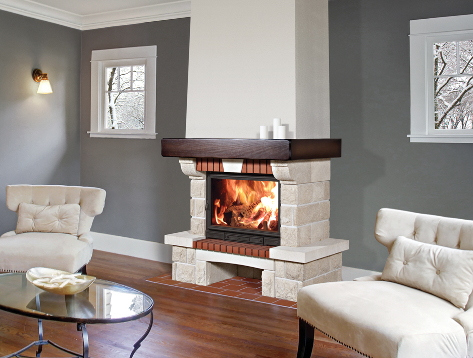 3. Модель с полкой из дуба с красным печным кирпичом из белого искусственного камня (залит в блоках) Pierre du Chateau